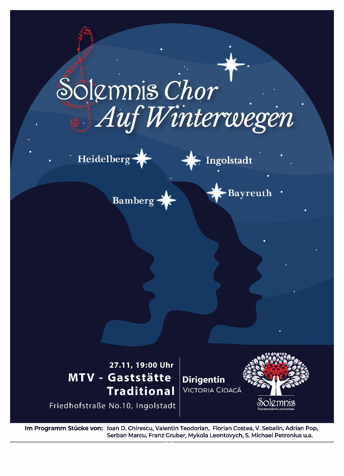 Chor Solemnis – „Auf Winterwegen“ in Ingolstadt Der Rumänischer Freundeskreis Ingolstadt e.V. freut sich, das Publikum zum Winterkonzert des Chor Solemnis mit dem Titel „Auf Winterwegen“ („Pe drumuri de iarnă“) einzuladen. 📅 Datum: 27. November🕖 Uhrzeit: 19:00📍 Ort: Restaurant Traditionell, Friedhofstraße 10, Ingolstadt🎟 Eintritt: frei Über den Chor Solemnis und die Dirigentin Victoria Cioacă Der […]